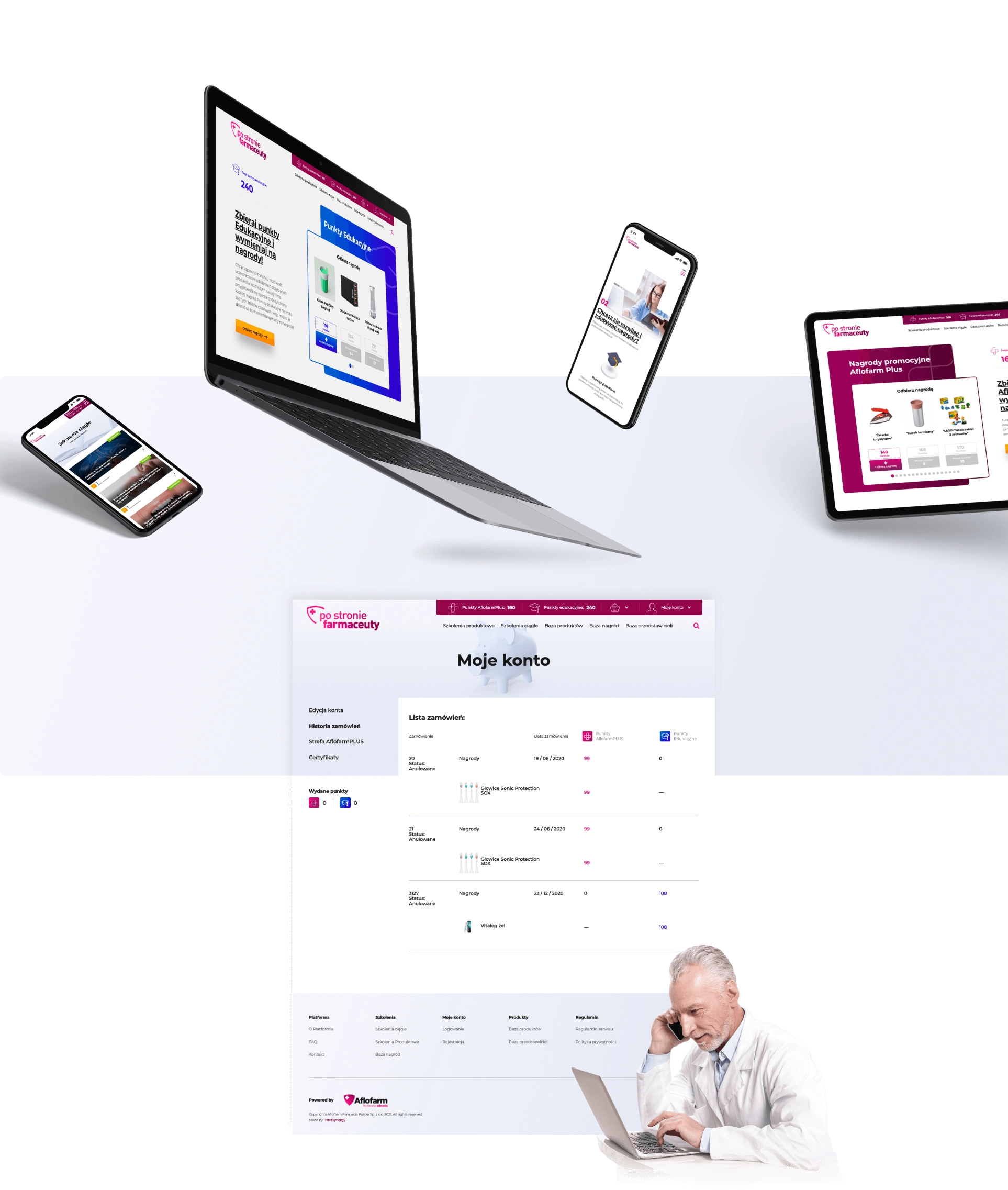 Wiedzieliśmy, że klient zamierza intensywnie promować swoje produkty poprzez wprowadzanie nowych szkoleń oraz motywować pracowników aptek do udziału w programie lojalnościowym poprzez atrakcyjne nagrody. Te potrzeby zostały w pełni zaspokojone poprzez możliwości jakie dawał panel administracyjny. Tworzenie szkoleń, dodawanie nagród, obsługa ich zamówień, edycja kont klientów oraz prezentacja nowych produktów firmy Aflofarm stały się prostsze niż kiedykolwiek.